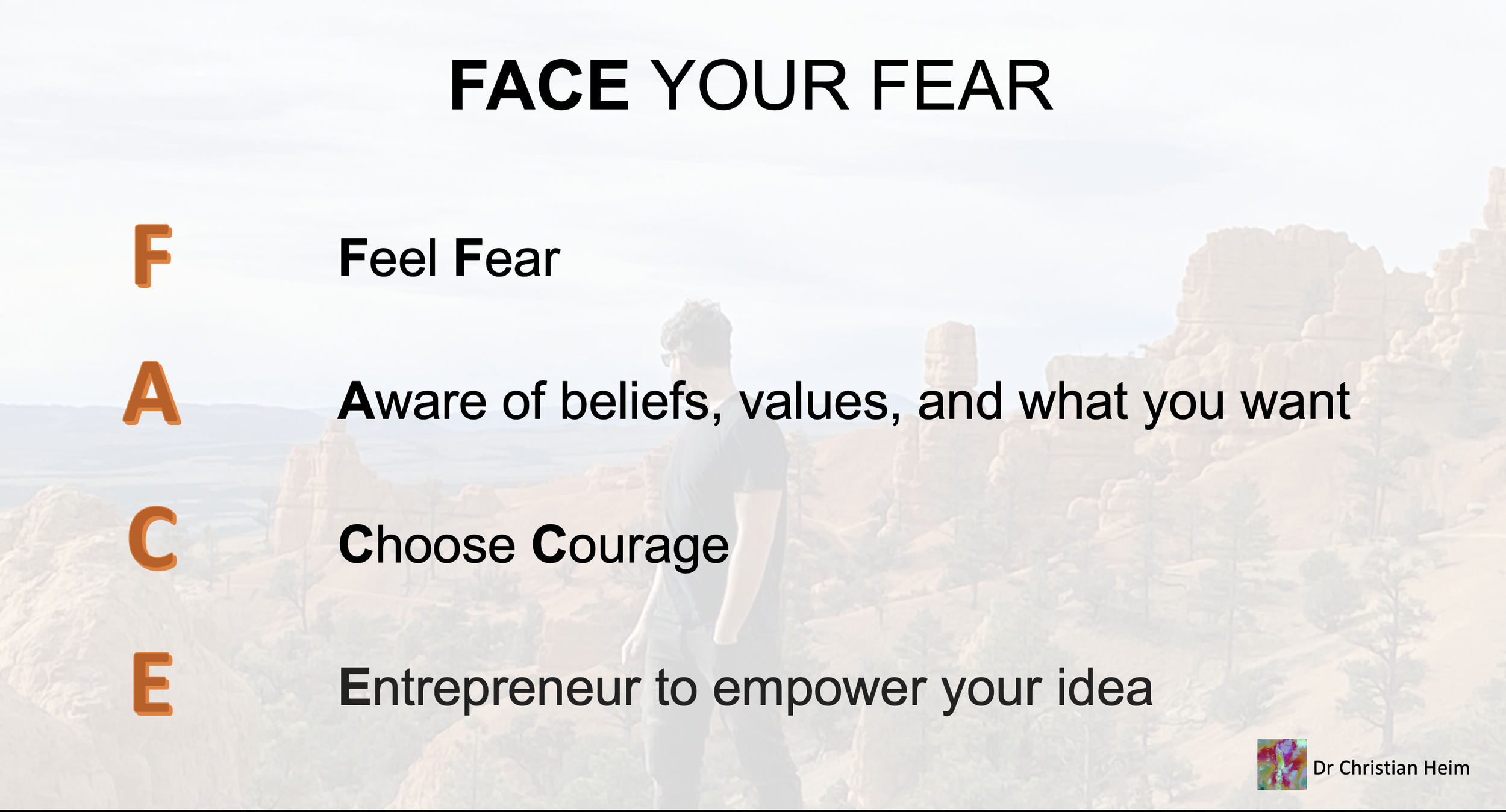 F A C E : FEEL THE FEAR. (from your amygdala, your fear, pain and alarm centre). If you didn’t feel fear you wouldn’t need courage. It’s always there. Even a bomb disposal expert may be afraid of snakes, a snake handler may be afraid of public speaking. Aim to let fear give you vital information, don’t let it enslave you. Remember the “Ooh Curiosity” exercise: what fears do you need to FACE? Can you be curious about them?